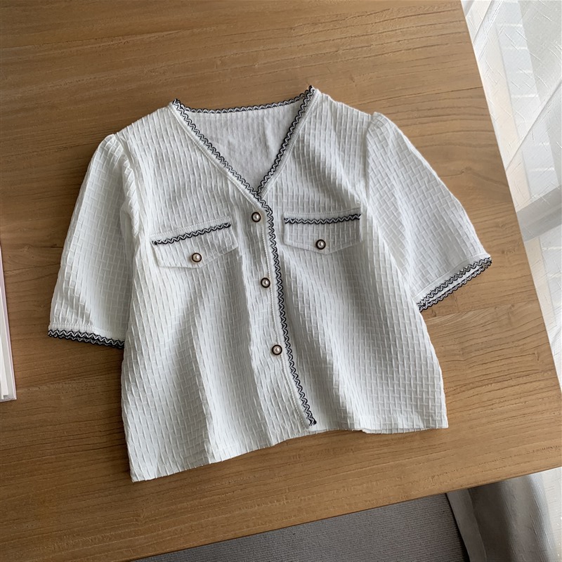 2021秋季新款法式小香风V领衬衫短袖女设计感气质短款上衣60236热门设计联盟服务商